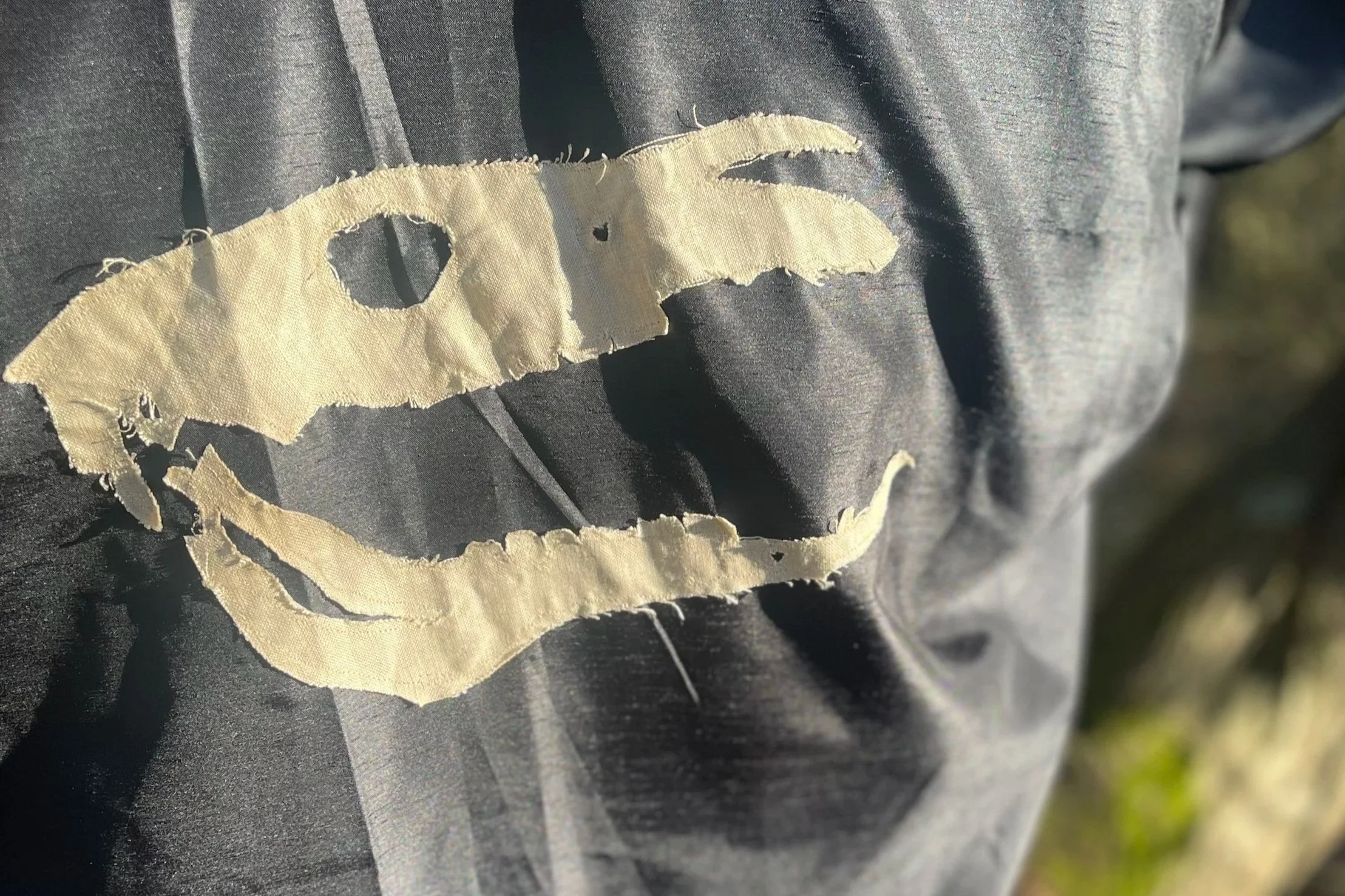 This ceremonial garment, featuring embroidered motifs of Grey Dolphin's skull and De Shurland's tomb graffiti, creates a visual dialogue between medieval folklore and contemporary environmental consciousness. The distinctive mask fuses marsh harrier imagery with plague doctor aesthetics, bridging historical medical practice with modern ecological protection.
